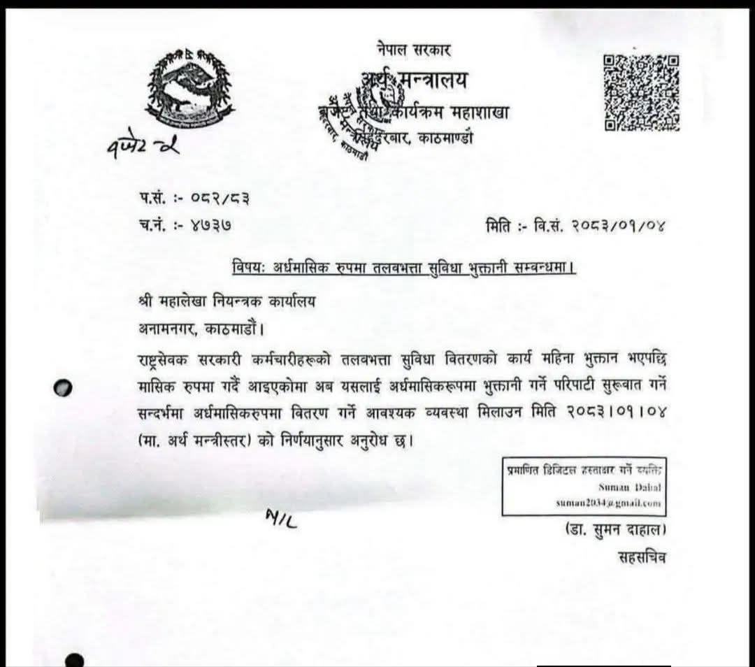 वैशाख ४ गतेको निर्णयमा मासिक रूपमा दिइँदै आएको तलबलाई अर्धमासिकरूपमा भुक्तानी गर्ने परिपाटीको सुरुवात गर्ने उल्लेख छ।